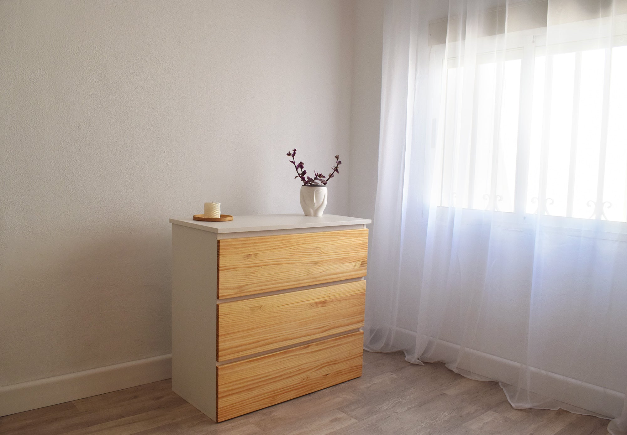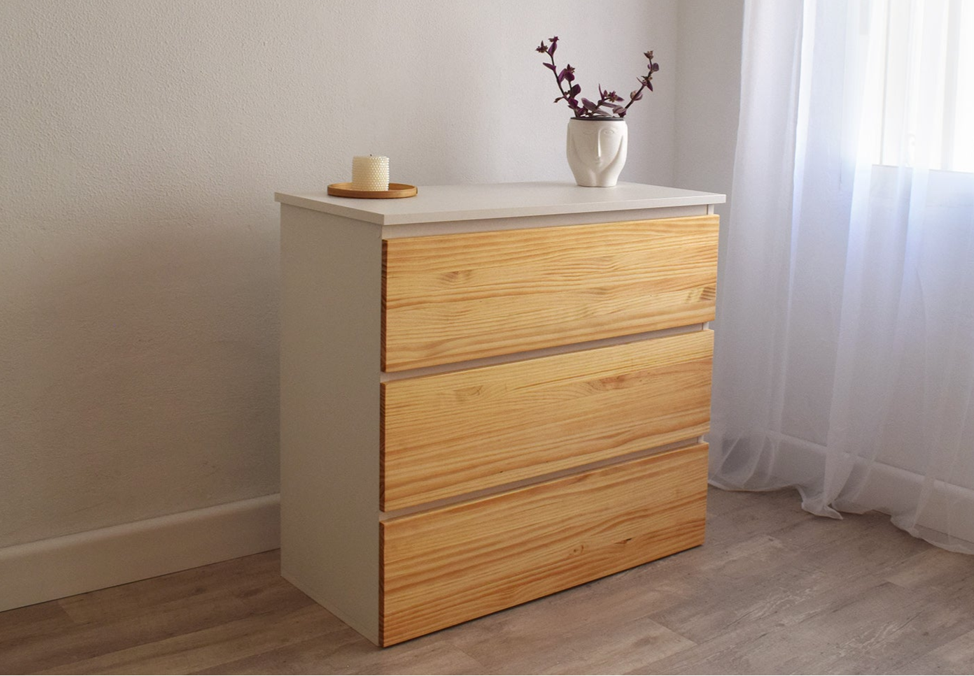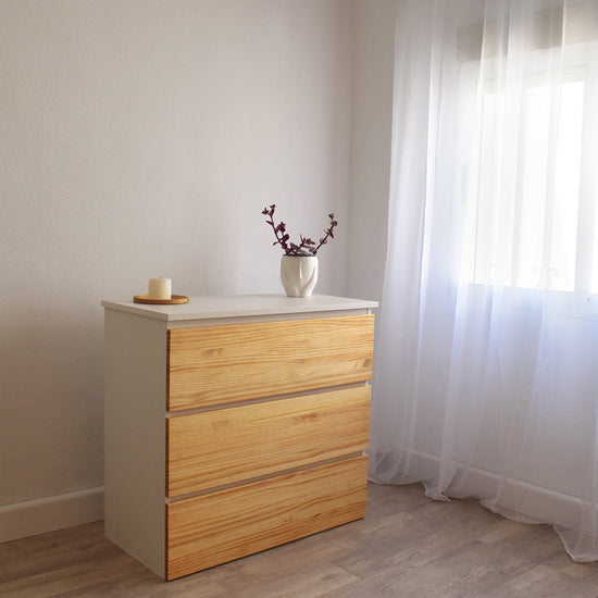 🪵 Diseño premium y resistente – Madera laminada blanca 19 mm + pino natural 18 mm encerado. 2 cajones con cierre suave y patines ABS.