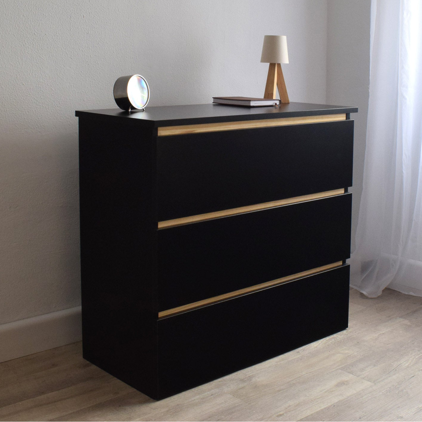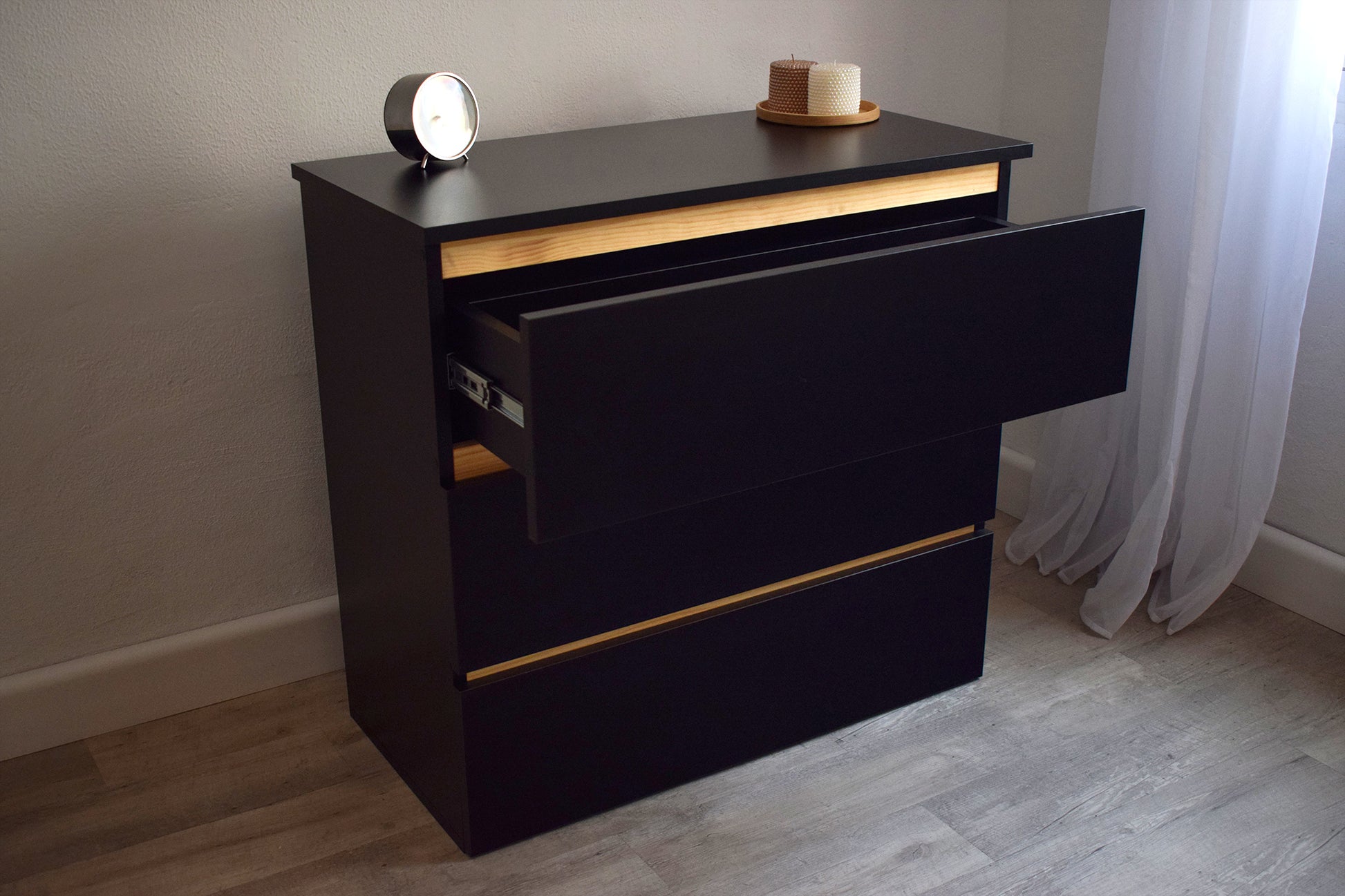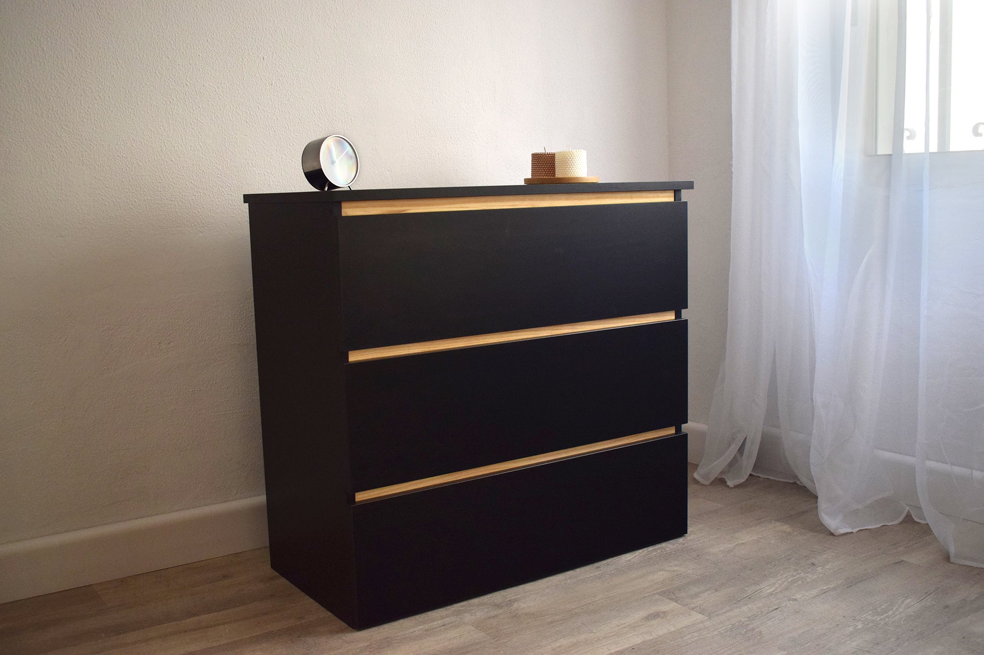 🪵 Diseño premium y resistente – Madera laminada negra 19 mm + embellecedores de pino natural 18 mm encerado. 2 cajones y patines ABS para proteger el suelo.