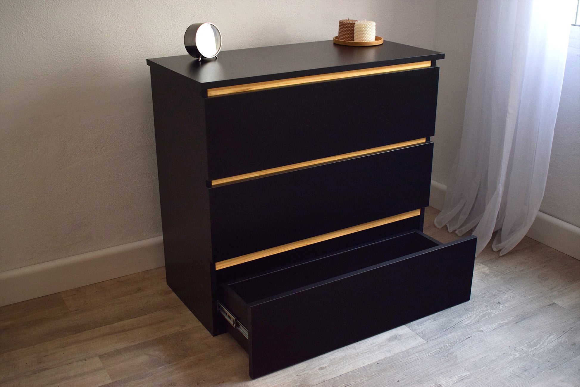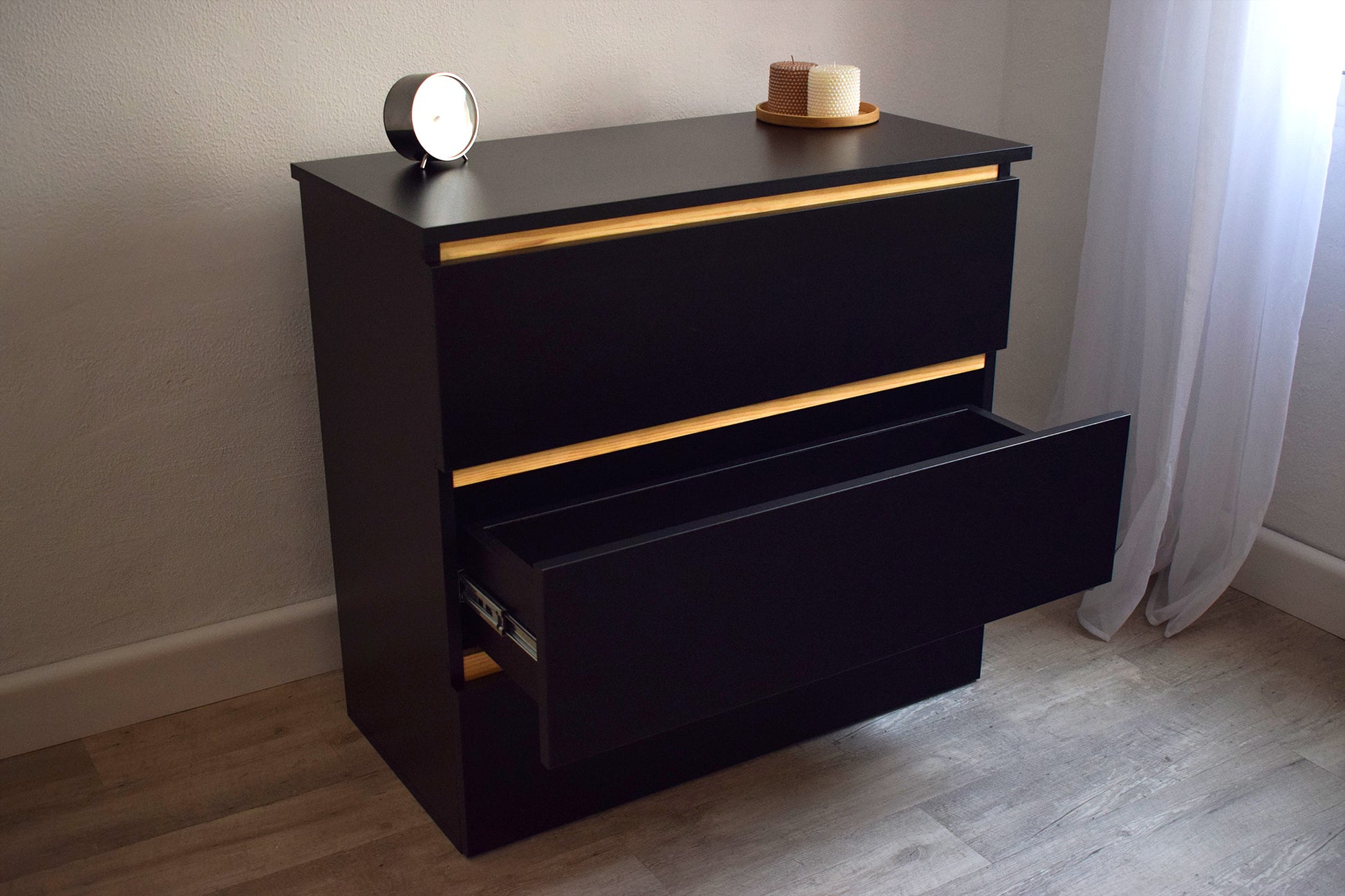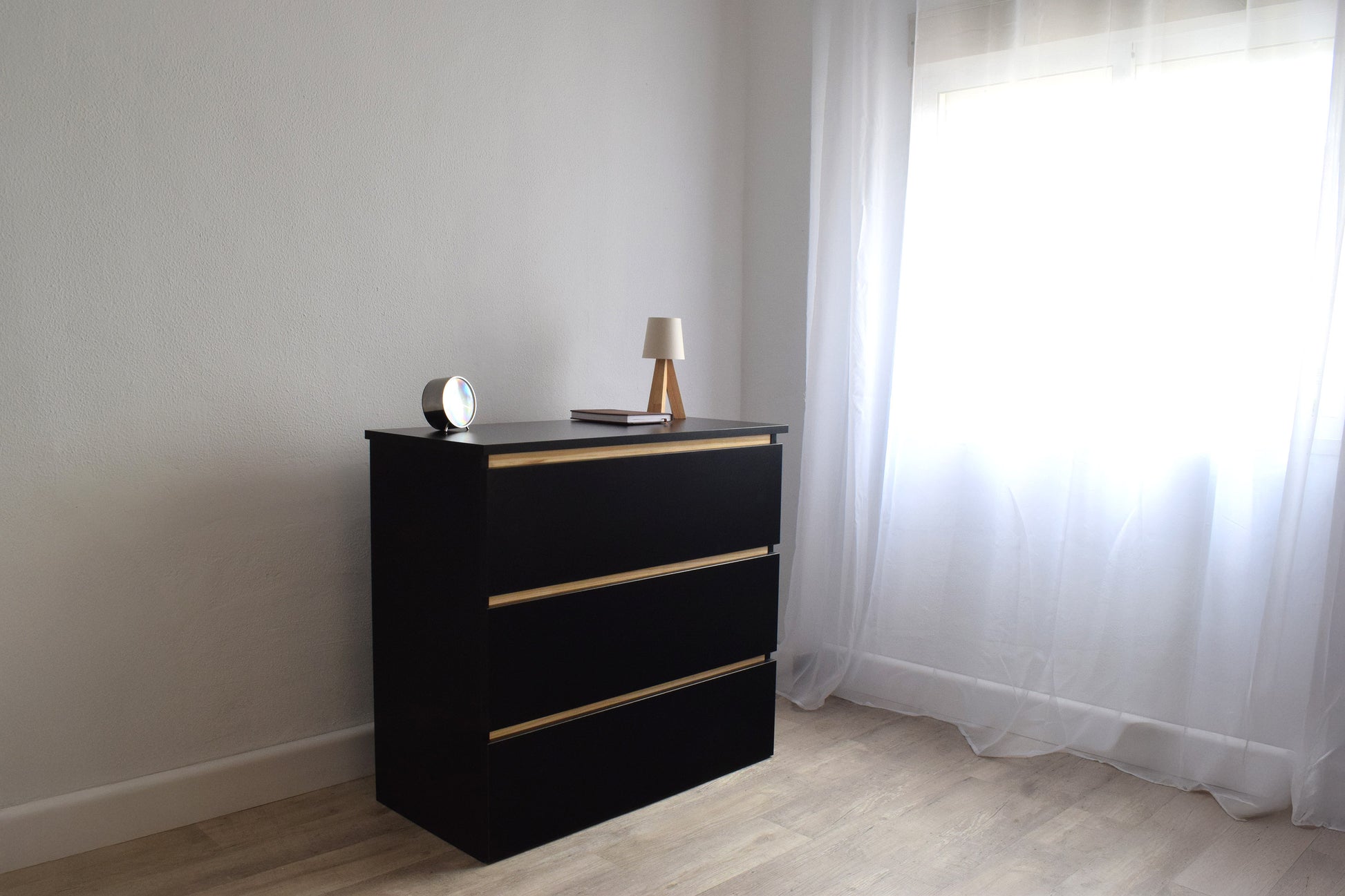 🪵 Diseño premium y resistente – Madera laminada negra 19 mm + embellecedores de pino natural 18 mm encerado. 2 cajones y patines ABS para proteger el suelo.