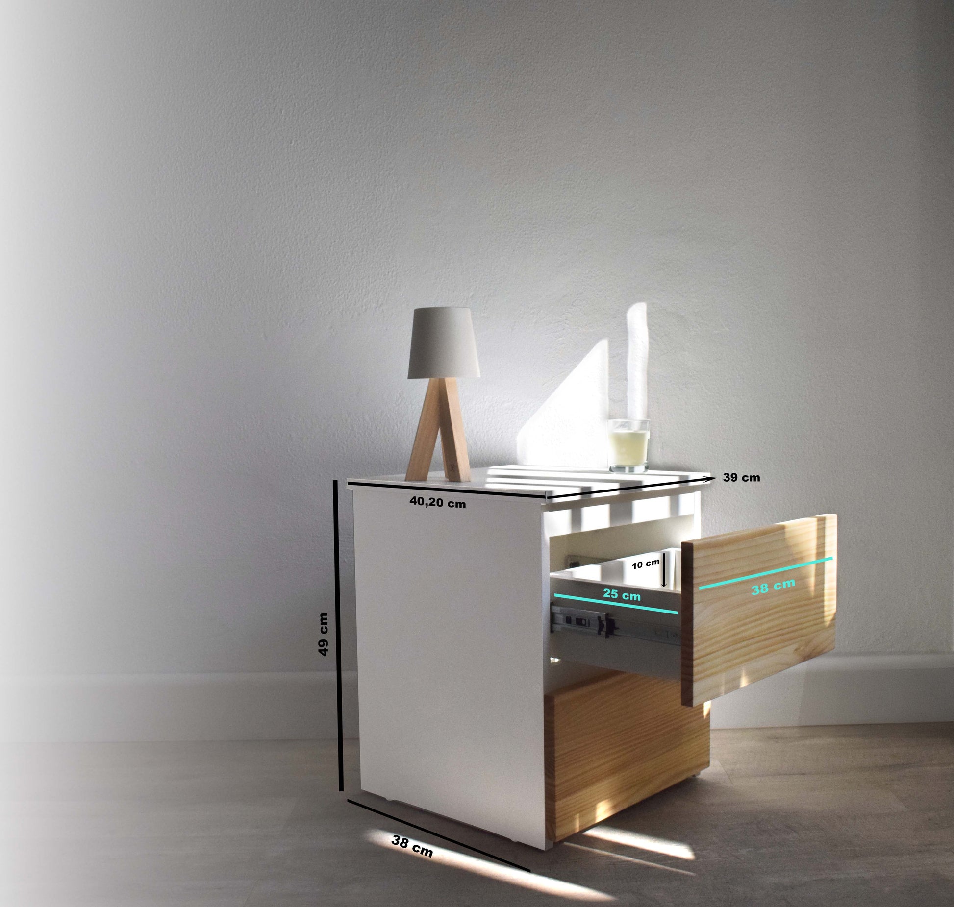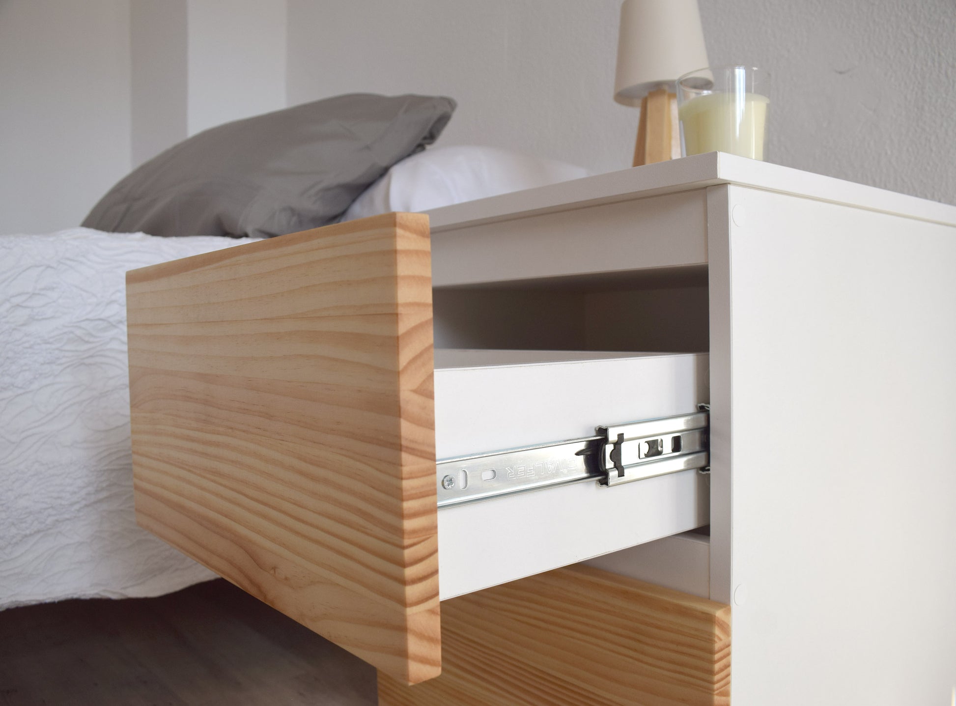 🏁 White Pine, contraste táctico – Cuerpo en melamina blanca resistente con frentes y detalles en pino natural; herrajes premium para una mecánica impecable.